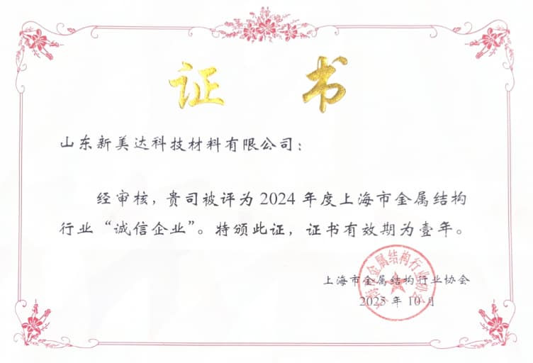 Recently, upon authentication by the Shanghai Metal Structure Industry Association,Shandong Shinmade Material Tech Co. has been awarded the title of "2024 Shanghai Metal Structure Industry Integrity Enterprise".